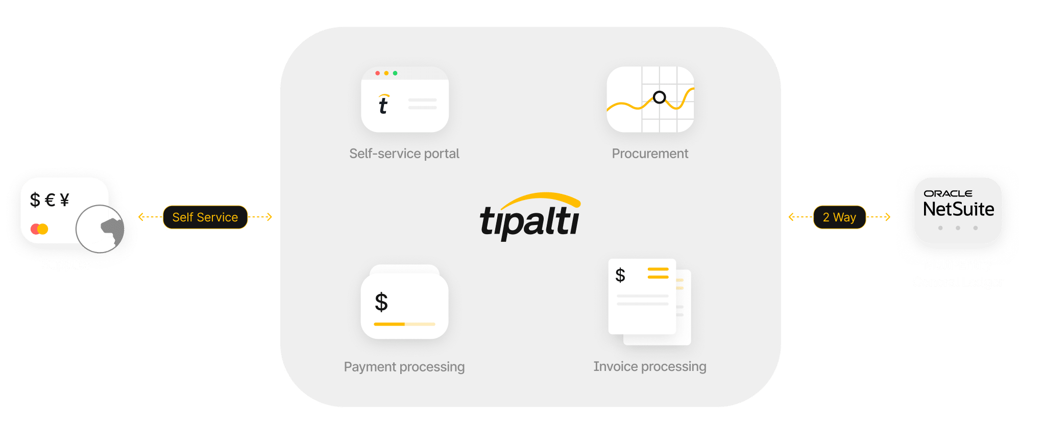 Tipalti extends NetSuite’s existing ERP capabilities by providing fully manageable and automated execution of global payables. Take control of supplier management, Procurement, invoice management, payment scheduling, global remittance, card spend, and supplier correspondence, with real-time multi-entity reconciliation of payment details with invoices and billing.
