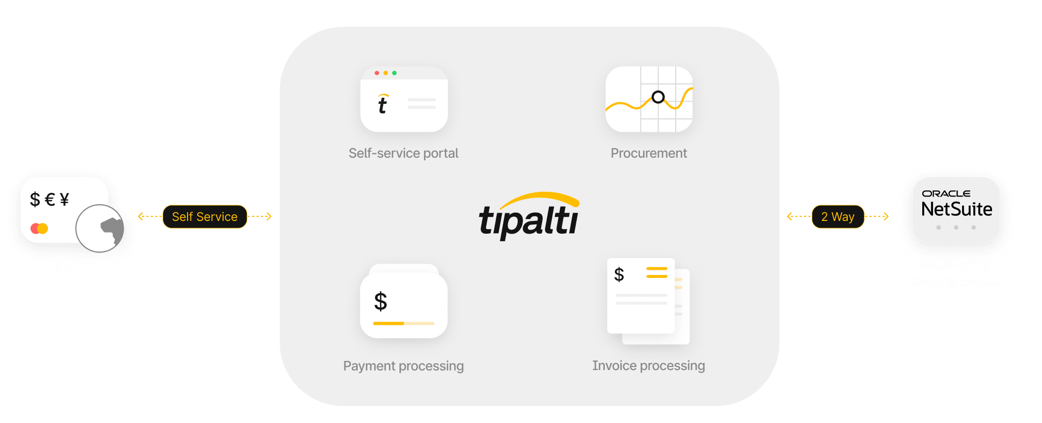 Tipalti extends NetSuite’s existing ERP capabilities by providing fully manageable and automated execution of global payables. Take control of supplier management, Procurement, invoice management, payment scheduling, global remittance, card spend, and supplier correspondence, with real-time multi-entity reconciliation of payment details with invoices and billing.