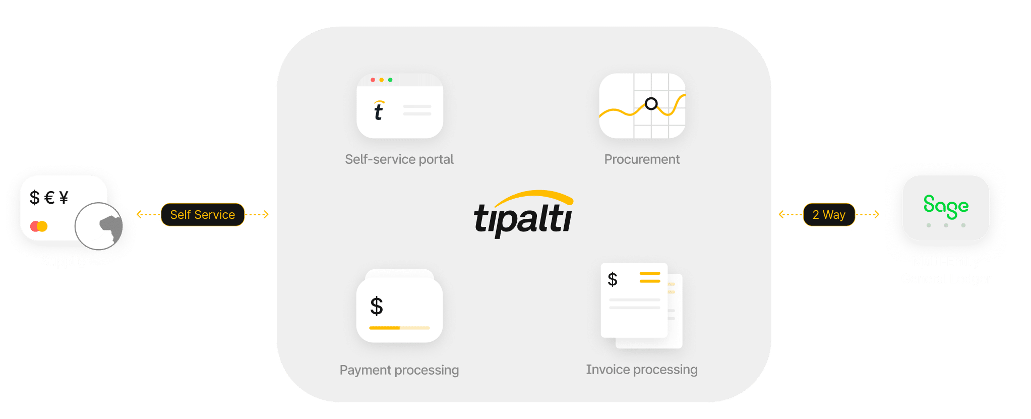Tipalti extends Sage’s existing ERP capabilities by providing fully manageable and automated execution of global payables. Take control of supplier management, Procurement, invoice management, payment scheduling, global remittance, and supplier correspondence, with real-time multi-entity reconciliation of payment details with invoices and billing.