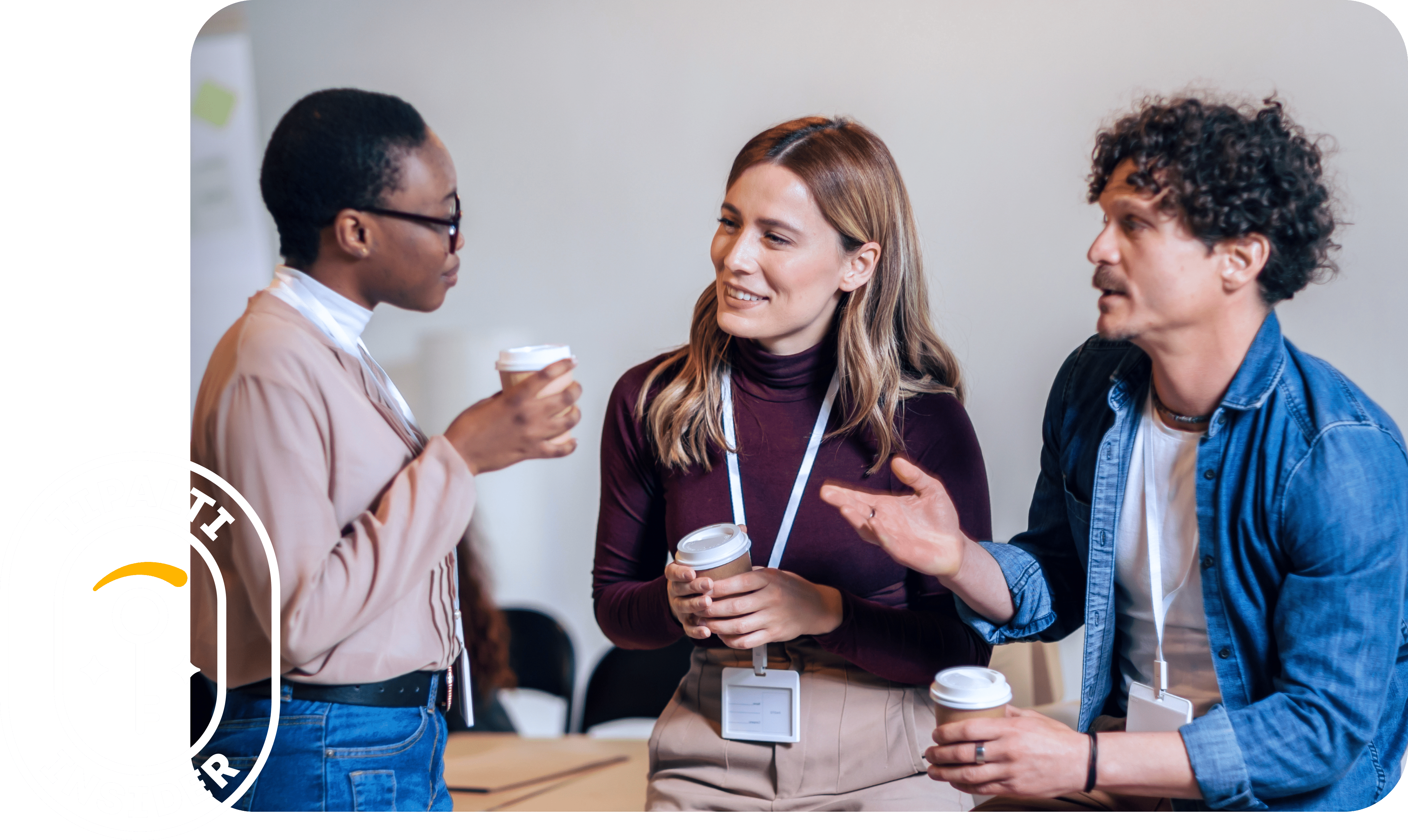 Three colleagues wearing lanyards converse while holding coffee cups in an office setting. The Tipalti Insider logo is visible in the lower left corner.